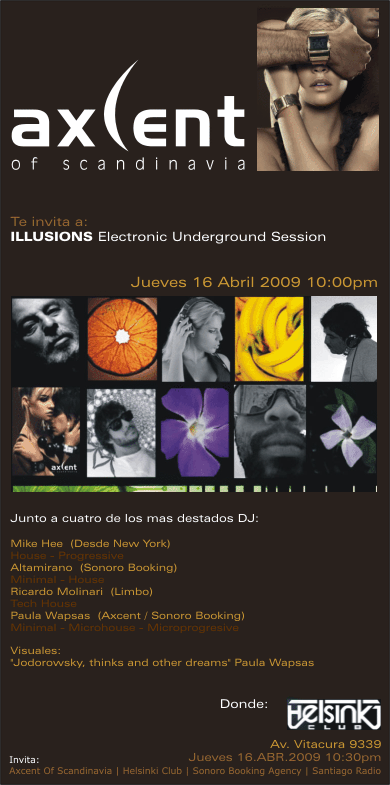 Agradecemos a todos los que asistieron a la Fiesta Axcent of Scandinavia en el Helsinki Club en Av. Vitacura 9339 el Jueves 16 Abril. Regalamos el primer Reloj Axcent of Scandinavia entre los asistentes, Poleras y Chaquetas Axcent además de descuentos especiales para usar cuando deseen en la compra de un modelo Axcent of Scandinavia. Inscríbete para las próximas fiesta aquí |